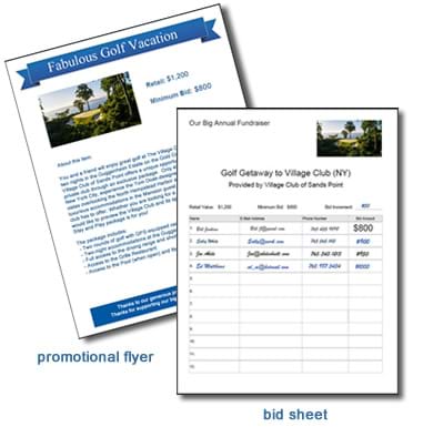 free and easy tool to generate promotional flyers and bid sheets for your upcoming silent auction. Simply upload a photo, description, value and minimum bid and our free tool will generate nice promotional flyers and bid sheets for your auction.